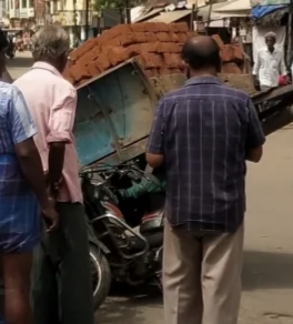 இப்படி ஒரு விபத்துதான் தஞ்சாவூர் கருந்தட்டங்குடி சாலையில் இன்று காலை 10 மணிக்கு நடைபெற்றது. தஞ்சாவூர் நகரை இணைக்கும் இரண்டு ஆற்றுப்பாலங்கள் இடிக்கப்பட்டு புதிதாக கட்டும் பணி நடந்து கொண்டிருக்கிறது அதன் காரணமாக போக்குவரத்துக்கள் மாற்றுப்பாதையில் இயக்கப்படுகின்றது கரந்தை பாலத்தை பயன்படுத்த முடியாத மக்கள் பயன்படுத்த அமைக்கப்பட்ட மாற்றுப்பாதையான கரந்தட்டாங்குடி திராவிட கூட்டுறவு வங்கியை ஒட்டியுள்ள தெருவிலிருந்து மாட்டு வண்டியில் செங்கல் ஏற்றிக்கொண்டு ஒரு சிறுவன் இரண்டு மாட்டு வண்டியை ஓட்டி வந்துள்ளார்.